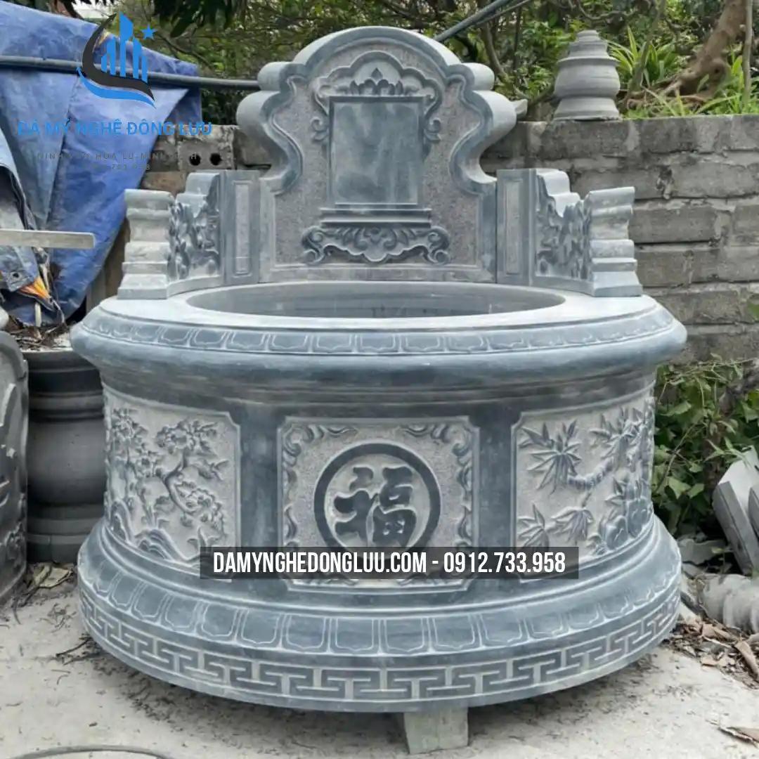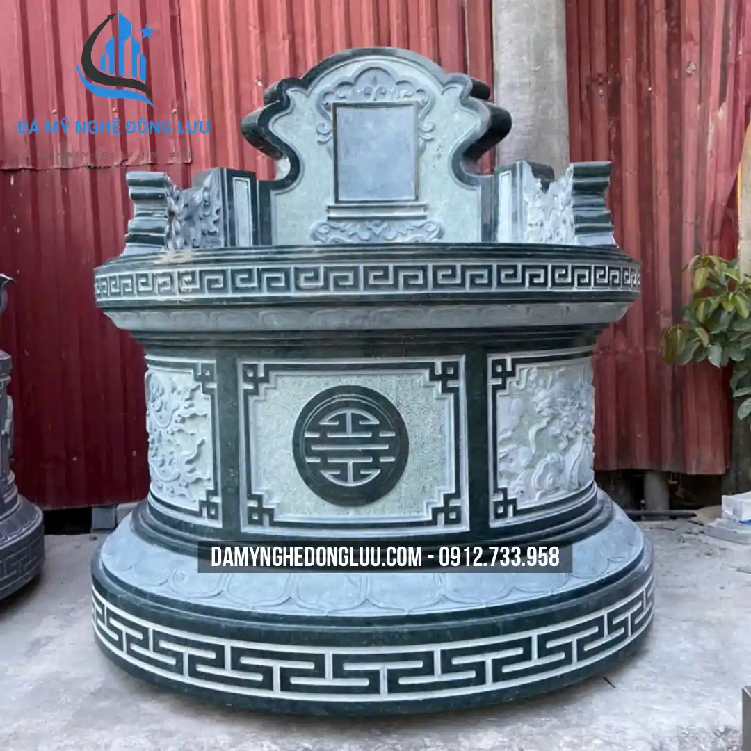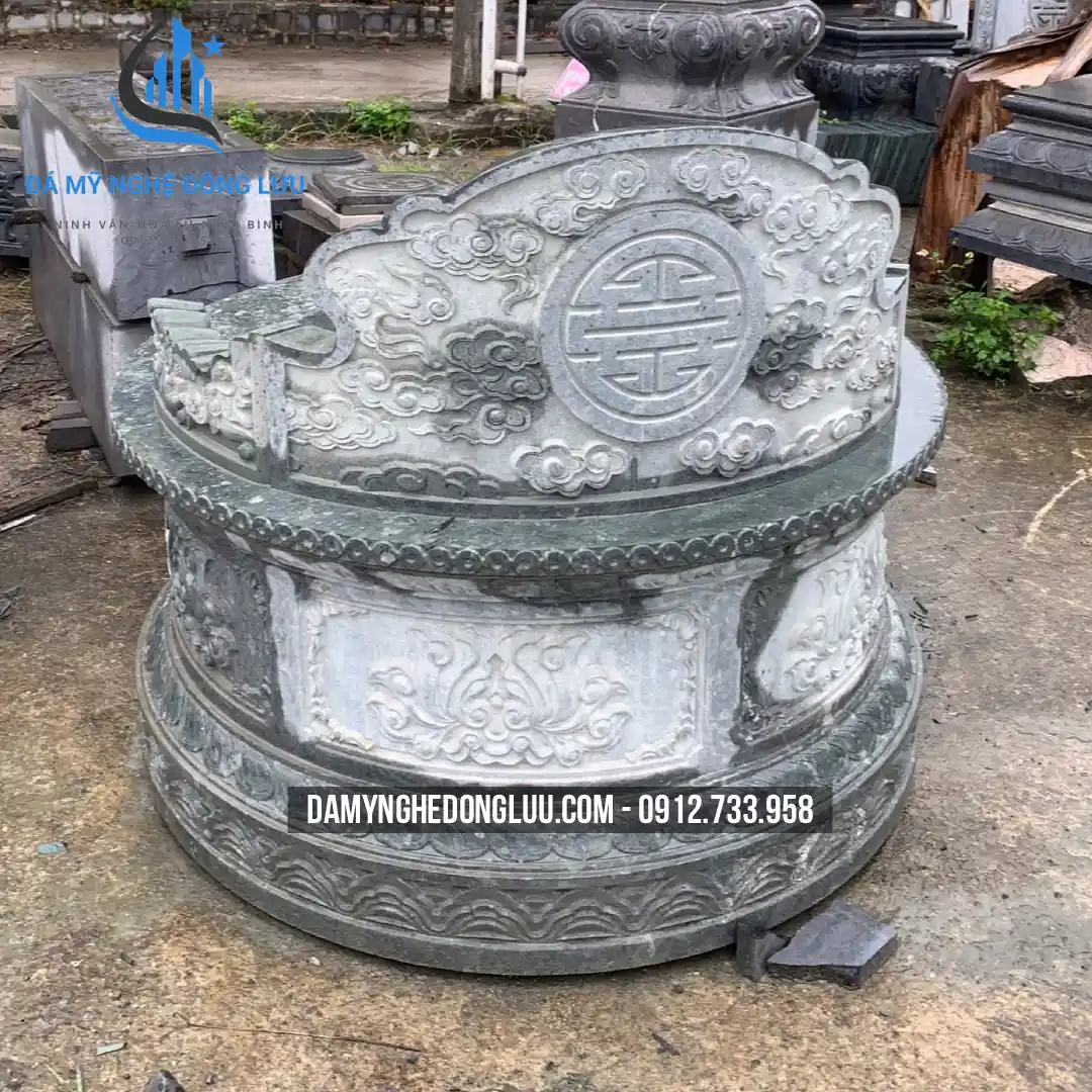 Mộ đá tròn thường được chế tác từ đá xanh Ninh Bình tự nhiên, bền đẹp với thời gian, chịu được mưa nắng khắc nghiệt. Trên thân mộ có thể chạm khắc các hoa văn long – ly – quy – phượng, hoa sen, mây trời… vừa tăng tính thẩm mỹ vừa mang ý nghĩa tâm linh.